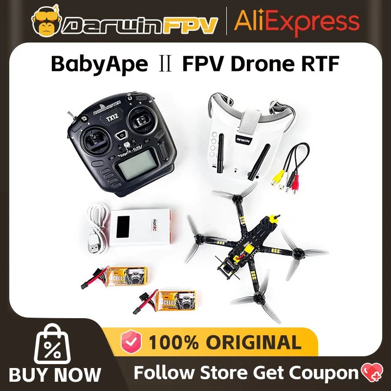 BabyApe Ⅱ RTF is the ideal choice for beginners to learn fpv drones. The BabyApe Ⅱ kit includes BabyApe Ⅱ fpv drone, Radiomaster TX12 MARK II transmitter, 5.8G Dual Antenna 40CH 3-inch glasses, 4S 850mAh battery and charger, etc., to solve your troubles of not knowing how to match them. Compared with the first generation of Baby Ape, BabyApe Ⅱ has a more powerful configuration, adopts more reliable manufacturing technology and a new power system, and has a higher level of performance, durability and power. With Radiomaster TX12 MARK II transmitter and 4s 850mAh batteries, the flight time can reach 13 minutes, the flight distance is 1.5 kilometers, and the maximum speed is 92km/h.