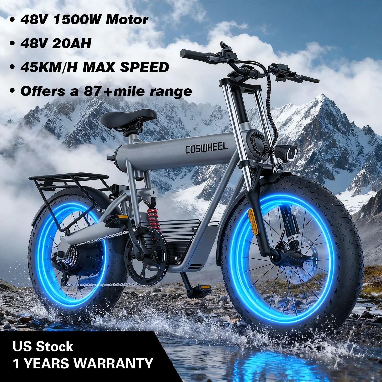 The COSWHEEL T20 is equipped with a 1500W brushless rear hub motor (with a rated power of 1000W, ensuring stable and reliable performance), delivering an impressive power experience: