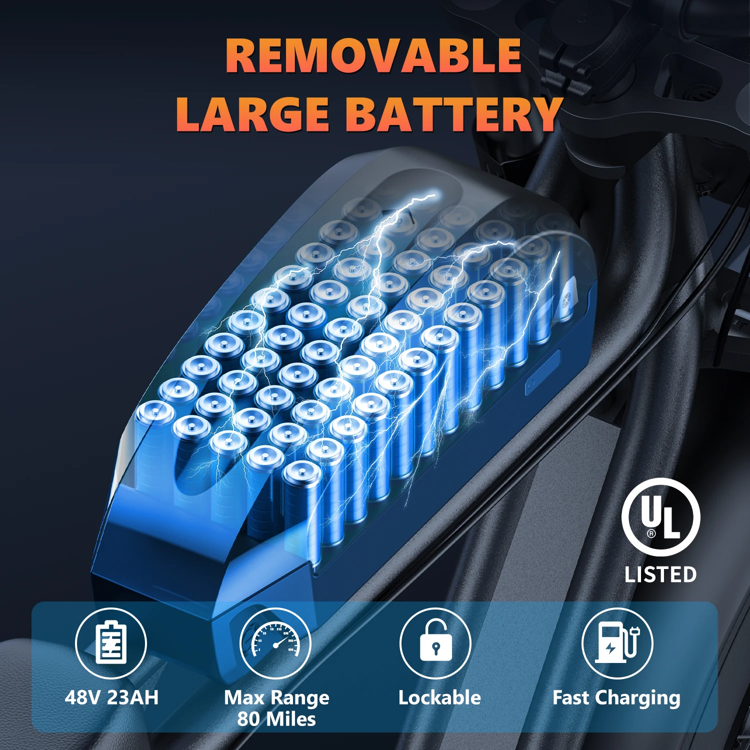 K7 uses a brushless motor 1500W. The motor is the heart of an electric bicycle and the most critical component of an electric bicycle. Its performance affects strength, speed, endurance and driving ability. The motor has a climbing angle of 30°, a torque of 80N·M, and a maximum speed of 33 mph.