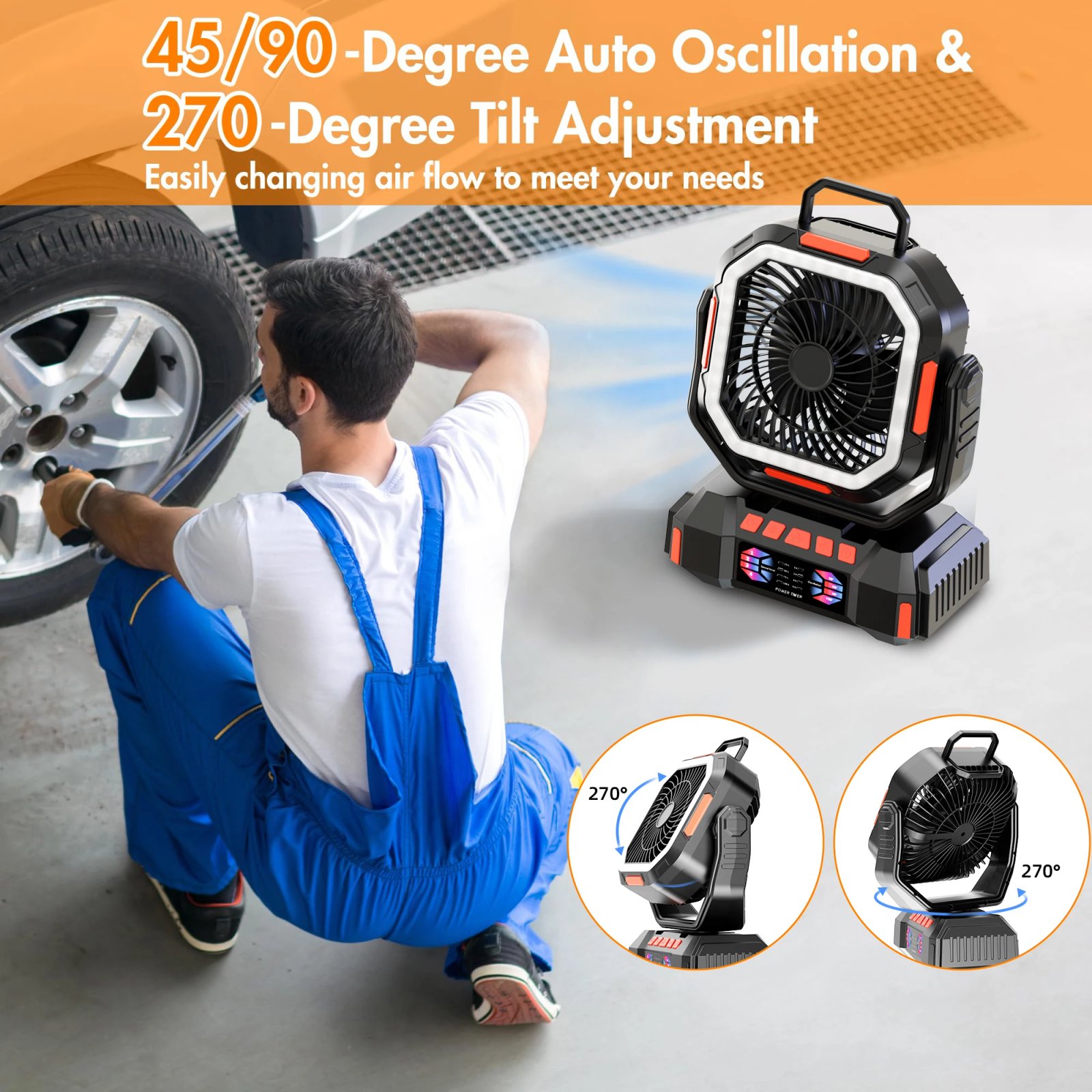 40000mAh Battery with Power Bank Function 3 in 1 Rechargeable battery powered fan, equipping with a light, power bank and fan, has 40000mAh large capacity battery with high conversion rate. 100% power can be used continuously for 58-1440 hours depending on different options. The portable camping fan have 5V/3A Type-C input/output and 5V/3A USB output charging port. Therefore you can use the battery operated fan as a large portable charger to reverse charging 2 phones for emergency using.