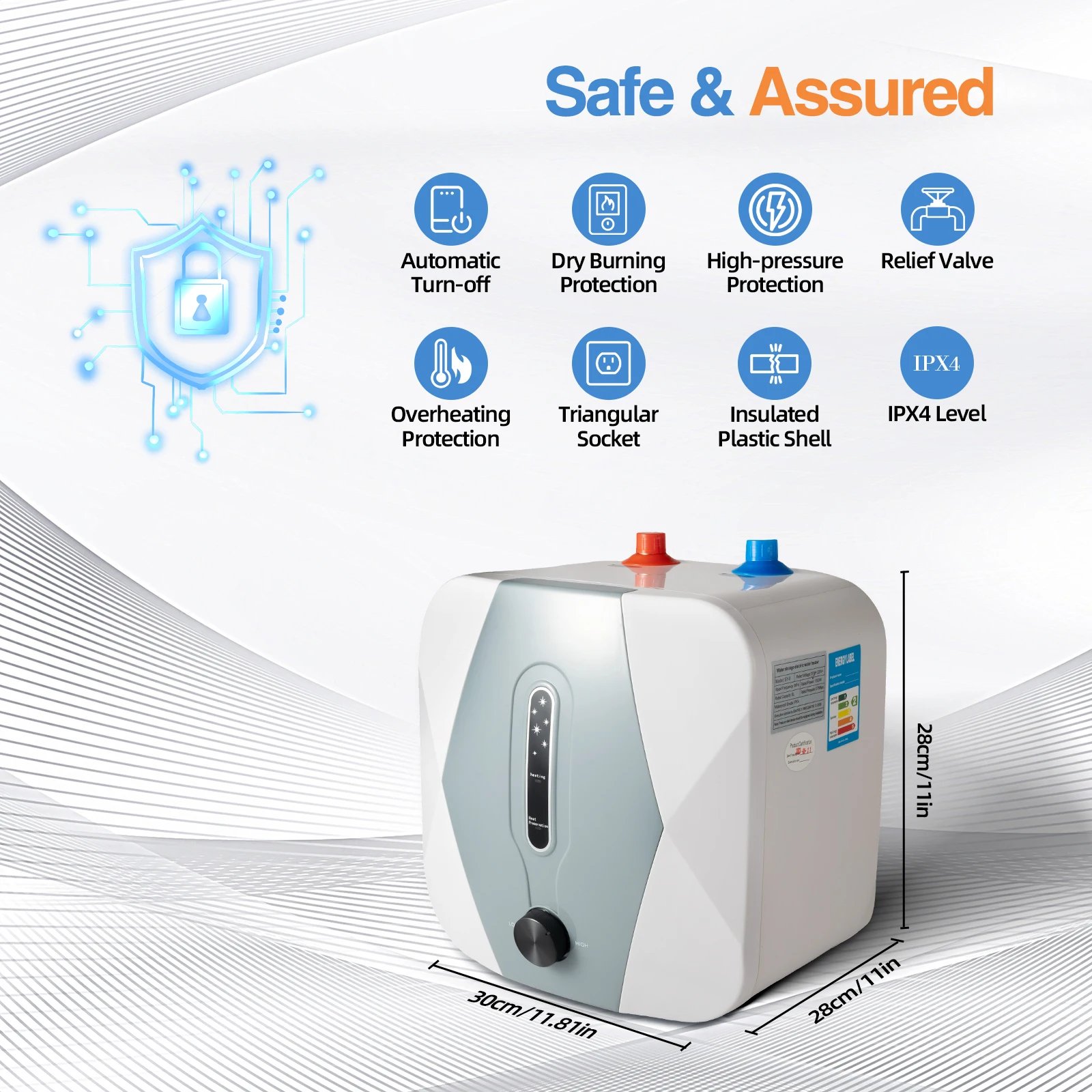 Large Capacity & Mini Size: Its size is very small(11.81*11*11in), but its capacity can reach 2.1 gallons. You can easily install it on walls or floors under sinks or in other small spaces to meet your hot water supply needs.