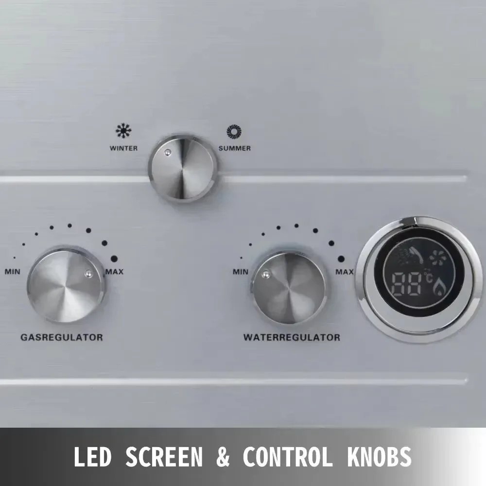 We adopt an LED screen to display real-time water temperature. Gas control knob: rotate it clockwise to increase the gas supply. Water control knob: turn it clockwise to get more hot water. Water temperature ranges from 50 °F to 140 °F.