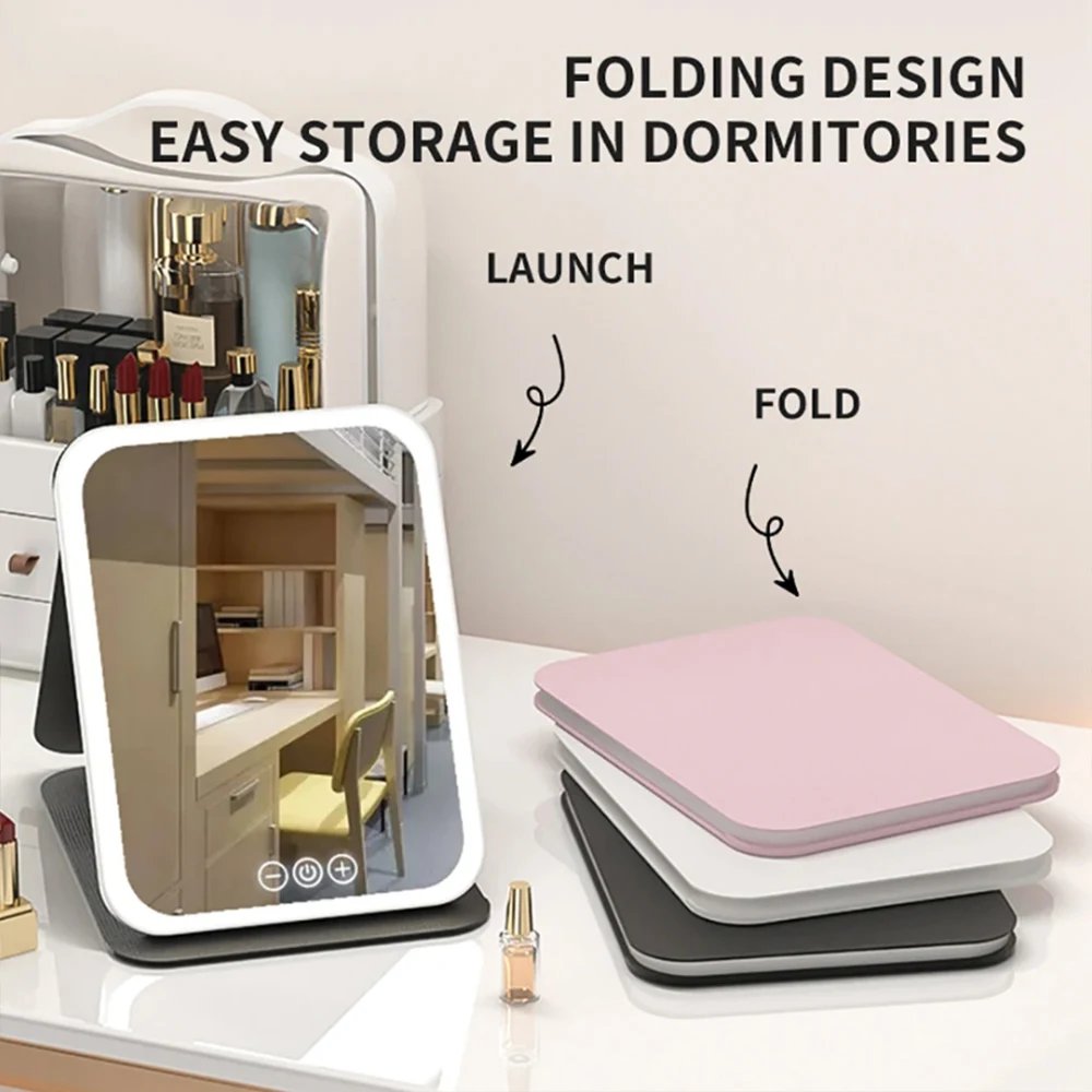 LED Makeup Mirror 3 Colors Light Portable Vanity with Adjustable Brightness USB Charging Foldable for Travel And Home Use