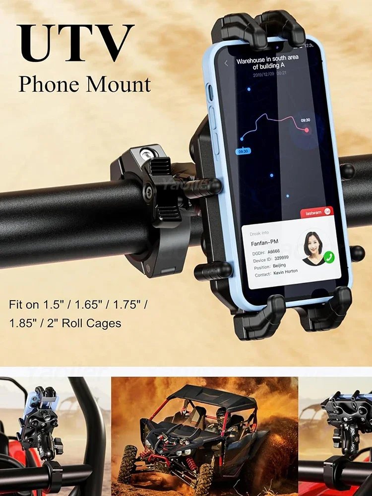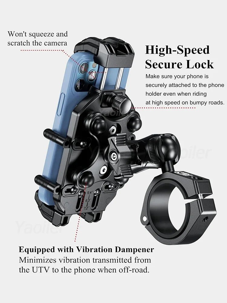 3. Anti-shock, protect mobile phone camera: Equipped with vibration dampener. The UTV roll cage cell phone mount also built-in with soft silicone that keep your phone from scratches and vibration. UTV phone mount & phone camera features a non-contact designed to keep the phone camera from being squeezed and scratched while driving